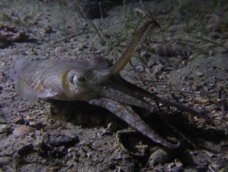 Bil je čist jasen večer. Nebo je bilo posuto z zvezdami, ko smo se pripeljali na lokacijo v Fiesi pa čisti mir. Nikogar nikjer. Po buddy checku sva se z Južnoafričanom vrgla iz čolna in sprva je zgledalo, da vidljivost ni najboljša vendar takoj ko sva se potopila na 4 metre se je odprla in videlo sej je vsaj 7m, kar je za Fieso dobro. Malo sem bil pod pritiskom saj sem vedel, da bo 100% zadovoljen le, če najdeva konjička saj je bil to glavni cilj. Tako sva na mestu kjer se po navadi nahajajo iskala kakšnih 10 minut brez uspeha (vsaj kar se konjička tiče). Sva našla pa vse drugo. V začetku potopa naju je obiskal ligenj, ki se je nekaj trenutkov še poigral z menoj in mojo lučjo. Sipe so bile na vsakih 5 metrov, prav tako tudi morski listi, po tleh so ležale škarpene in škarpoči, videla sva veliko morsko lastovico, dva šila... Videl sem malo jeguljo, ki je v vseh potopih v Fiesi še nisem videl. Skratka polno raznega morskega življenja, ki ga očitno v tem času še posebej po noči mrgoli. Ker nama še vedno ni uspelo najti morskega konjička sva se odločila, da se odpraviva proti motorju in katrci. Tam sva naredila en krog in se odpravila nazaj. Tudi nazaj grede greben ni razočaral. Videla sva dva Jastoga, ki sta kukala iz svojih lukej, ob grebenu je mrgolelo raznih rakcev. Tik pred čolnom pa sva končno našla kar sva iskala. Morskega konjička! In to ne enega, kar dva. En je bil rjav, teh je v fiesi kar nekaj, drug pa rumen, ki pa je tukaj prava redkost. To je bila pika na i. Na koncu sva se pod čolnom še malo poigrala s planktonom in ko sem pogledal na moj potapljaški računalnik je ura na njem kazala že 65 minut. Kako hitro je minilo. Seveda, na poti nazaj ni manjkalo navdušenja ne z njegove, še manj pa z moje strani.